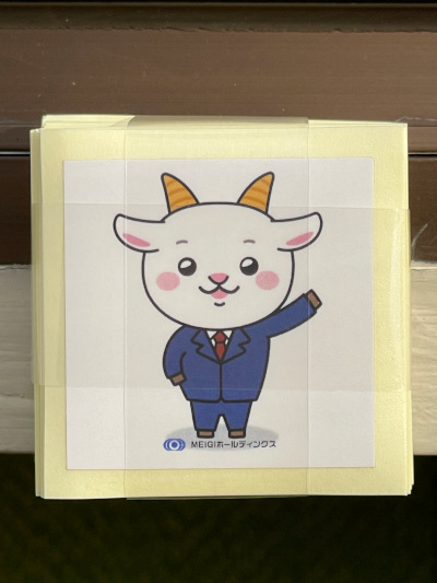 株式会社MEIGIホールディングスの企業マスコット「メェーギくん」の等身大パネルです。大きさは160cmほどになります。メェーギくんの足元には、社名とロゴが入ったパネルが置いてあります。